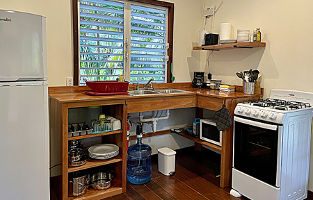 We have five rentals in total; two identical studio apartments on the ground floor of our home and three cabins. All but one unit have full kitchens with cooking basics provided, AC & fans, WiFi, unlimited drinking water, smart TV’s and best of all, a bike for every guest!