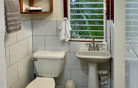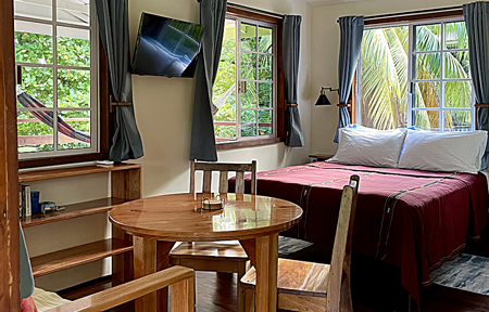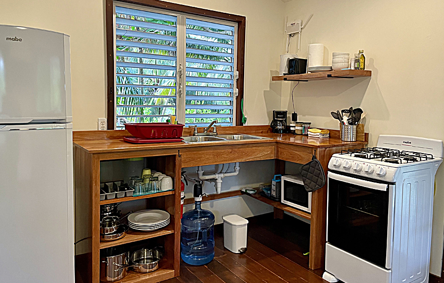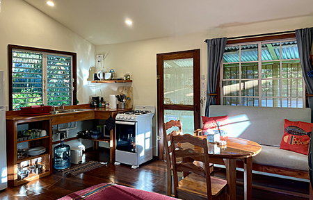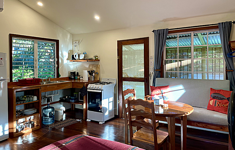 We have five rentals in total; two identical studio apartments on the ground floor of our home and three cabins. All but one unit have full kitchens with cooking basics provided, AC & fans, WiFi, unlimited drinking water, smart TV’s and best of all, a bike for every guest!